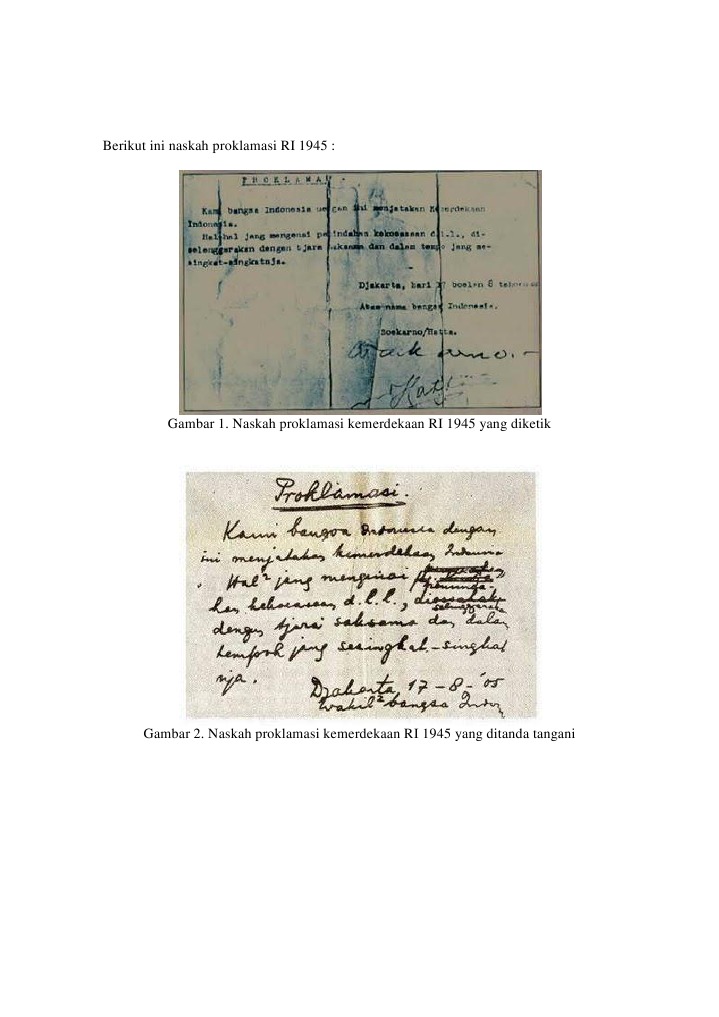 Pelaksanaan di lapangan ikada akan memicu bentrok dengan jepang Di hari yang sama, para pemuda mengantarkan soekarno dan hatta kembali ke jakarta untuk segera merumuskan naskah proklamasi. Sunario tengah berpidato pada sesi terakhir kongres (sebagai utusan kepanduan) sambil berbisik kepada soegondo: Ik heb een eleganter formulering voor de resolutie (saya mempunyai suatu formulasi yang lebih elegan untuk keputusan kongres ini), yang kemudian soegondo membubuhi. Tetapi karena ada kemungkinan timbul bentrokan dengan pasukan jepang yang terus berpatroli, akhirnya diubah di kediaman soekarno, jl. Teks naskah proklamasi atau proklamasi klad adalah naskah asli yang merupakan tulisan tangan sendiri oleh ir. Adapun pembacaan proklamasi kemerdekaan indonesia dilaksanakan pada jumat, 17 agustus 1945, jam 10.00 wib. Pamuntjak, abdul kadir, dan ar baswedan, yang ditugaskan menjadi tim diplomasi ri ke timur tengah. Ia bersama haji agus salim, nazir dt. Mohammad hatta dan raden achmad soebardjo djojoadisoerjo. Para pemuda tersebut sudah mendesak kedua tokoh terkemuka tersebut untuk segera mendeklarasikan kemerdekaan ri dari tangan penjajah saat itu, yaitu pemerintah jepang. Oct 10, 2019 · naskah teks proklamasi dirumuskan oleh ir. Naskah asli teks proklamasi ditulis tangan oleh ir.
